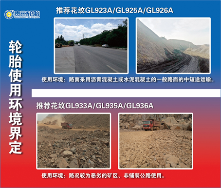 GL933A/GL935A/GL936A系列輪胎用于短途惡劣路況的載重自卸車。該系列輪胎采用礦山專用的配方,車速(重載)控制在40km/h以下的短途運輸,輪胎的抗刺扎性能、抗崩掉塊性能更佳,有效延長輪胎在礦山等惡劣路面行駛的使用壽命;加厚的胎側設計,胎側的剛性更強,有效防止雙胎并裝時胎側夾石,為輪胎提供更好的安全保護;具有核心專利的輪胎子口設計,為輪胎提供更好的承載能力和抗爆性能。