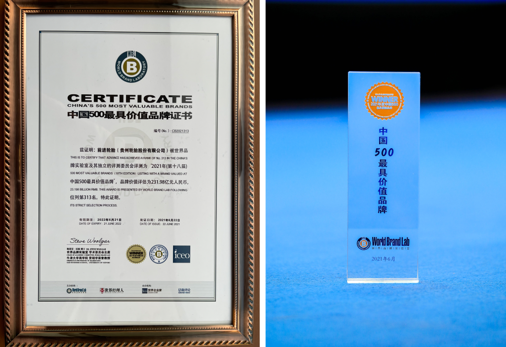 6月22日下午,由世界品牌實驗室(World Brand Lab)主辦的(第十八屆)“世界品牌大會”在北京舉行,會上發布了2021年《中國500最具價值品牌》分析報告,在這份基于財務數據、品牌強度和消費者行為分析的年度報告中,貴州輪胎前進品牌以價值231.98億元人民幣位列2021年中國500最具價值品牌313位,比2020年上升49位,品牌價值增加71.67億元人民幣,實現了品牌價值的持續提升。